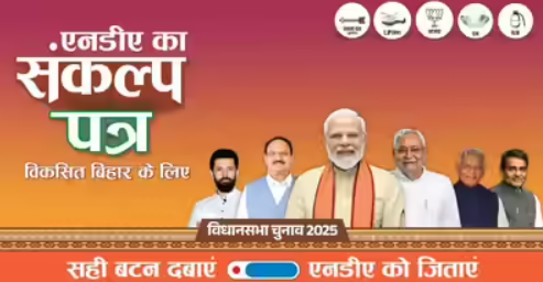 जनप्रवाद ब्यूरो, नई दिल्ली। बिहार चुनाव को लेकर सरगर्मियां तेज हो गई हैं। एनडीए ने आज घोषणा पत्र जारी किया। इसमें एनडीए ने वादों की झड़ी लगा दी है। मेनिफेस्टो में 125 यूनिट फ्री बिजली, 1 करोड़ नौकरियां, 4 नए शहरों में मेट्रो जैसे बड़े चुनावी वादों का ऐलान किया गया है। बिहार विधानसभा चुनावों के लिए कैंपेन तेज हो गया है। कल पीएम मोदी, अमित शाह और कांग्रेस सांसद राहुल गांधी ने चुनावी सभा को संबोधित किया। आज एनडीए ने अपने घोषणापत्र में बिहार के विकास का ब्लूप्रिंट तैयार किया। इस घोषणापत्र में समाज के सभी वर्गों, विशेषकर महिलाओं और युवाओं को साधने के लिए कई बड़े वादों की घोषणा की गई है। बता दें कि महागठबंधन अपना घोषणापत्र पहले ही जारी कर चुका है। एनडीए ने अपना घोषण पत्र पटना के एक बड़े होटल में जारी किया। इस दौरान सभी घटक दलों के प्रमुख नेता मौजूद रहे। सीएम नीतीश कुमार, भाजपा के राष्ट्रीय अध्यक्ष जेपी नड्डा, केंद्रीय मंत्री जीतन राम मांझी और चिराग पासवान मौजूद रहे। इसके अलावा सांसद उपेंद्र कुशवाहा, बिहार भाजपा के चुनाव प्रभारी धर्मेंद्र प्रधान, भाजपा अध्यक्ष दिलीप जायसवाल, जदयू के कार्यकारी अध्यक्ष संजय झा ने ब्लू प्रिंट जारी किया। इस बार घोषण पत्र को संकल्प पत्र 2025 नाम दिया गया है।