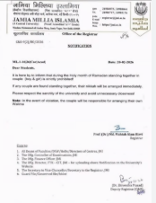 जनप्रवाद ब्यूरो, नई दिल्ली: सोशल मीडिया पर इन दिनों जामिया मिल्लिया इस्लामिया विश्वविद्यालय का नोटिफिकेशन वायरल हो रहा है। नोटिफिकेशन में यह दावा किया जा रहा है कि यदि रमजान माह में कॉलेज कैंपस में कोई भी लड़का या लड़की एक साथ खड़ा दिखाई दिया तो उनका निकाह करा दिया जाएगा। अब इस संबंध में जामिया मिल्लिया इस्लामिया विश्वविद्यालय की ओर से नोटिफिकेशन जारी किया गया। परिपत्र सोशल मीडिया पर वायरल नोटिफिकेशन का खंड़न करता है। विश्वविद्यालय ने नोटिफिकेशन में कहा है कि 20 फरवरी की कथित सूचना "पूरी तरह से फर्जी" है और उसके अधिकारियों द्वारा ऐसा कोई निर्देश जारी नहीं किया गया है। आधिकारिक बयान के अनुसार प्रशासन ने छात्रों और कर्मचारियों से संदेश को गंभीरता से न लेने का आग्रह किया है, क्योंकि ऐसा प्रतीत होता है कि इसका उद्देश्य संस्थान की छवि को धूमिल करना है। विश्वविद्यालय के अधिकारियों ने बताया कि फर्जी नोटिस के प्रसार के संबंध में दिल्ली पुलिस में शिकायत दर्ज कराई गई है।